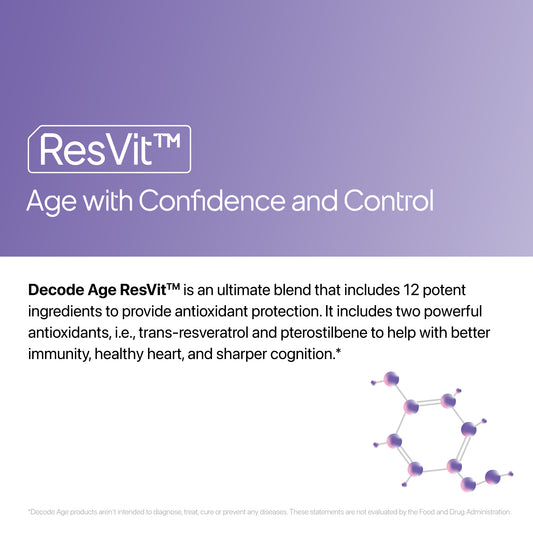 Decode Age ResVit™ Supplement | Antioxidant Supplement Blend | Supports Heart, Brain, and Eye Health | Trans Resveratrol, Pterostilbene, NAC, Vitamin E and A | 30 Tablets, Vegan