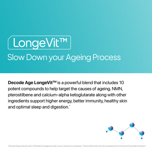 Decode Age LongeVit™ Supplement | NAD+ Supplement Blend | Supports Energy, Immunity, Sleep, Brain, and Skin Health | NMN, Pterostilbene, CoQ10, Ca AKG | 30 Tablets, Vegan