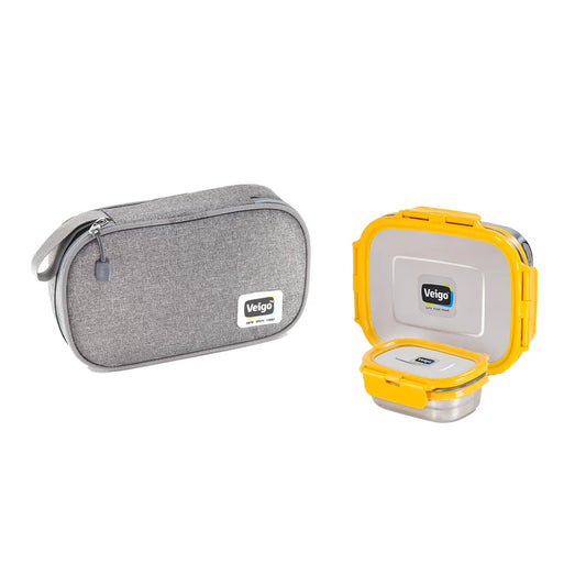 Veigo On The Go - Stainless Steel Large Lunch Box with Veg Box in a Flat Insulated Pouch