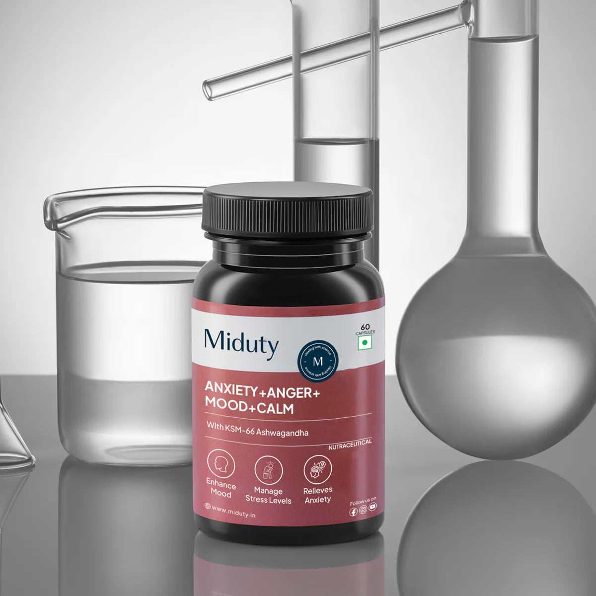 Miduty Anxiety + Anger + Mood + Calm is formulated with the superior KSM-66 Ashwagandha, L-Theanine, GABA, and Organic Holy Basil to help you regain control over stress, mood swings, and anxiety.
