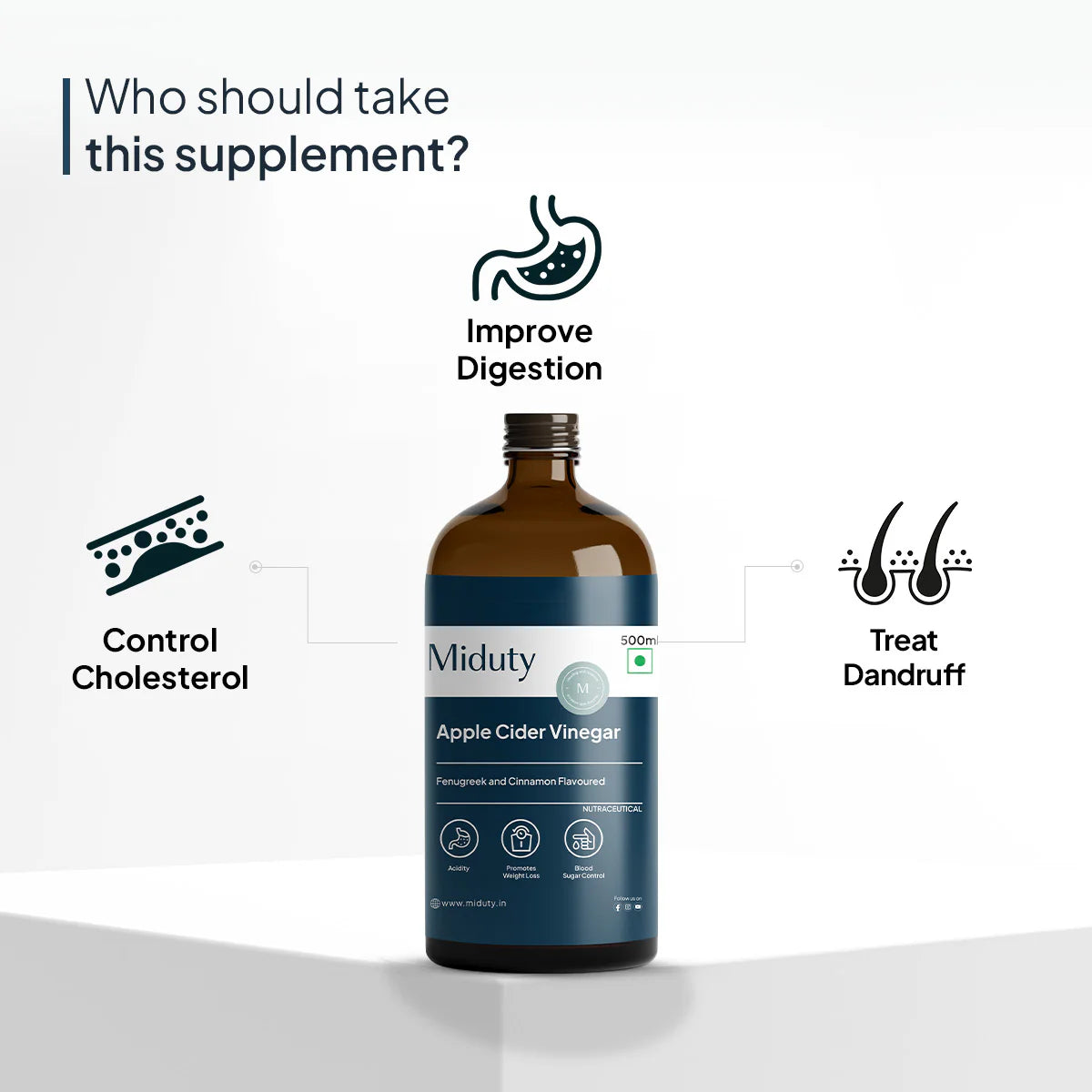 Crafted with a potent blend of fenugreek, cinnamon extracts, and stevia, Miduty Apple Cider Vinegar is a natural and effective health companion. Fenugreek supports digestive health and aids in weight management, while cinnamon enhances metabolism and adds a delightful flavor.
