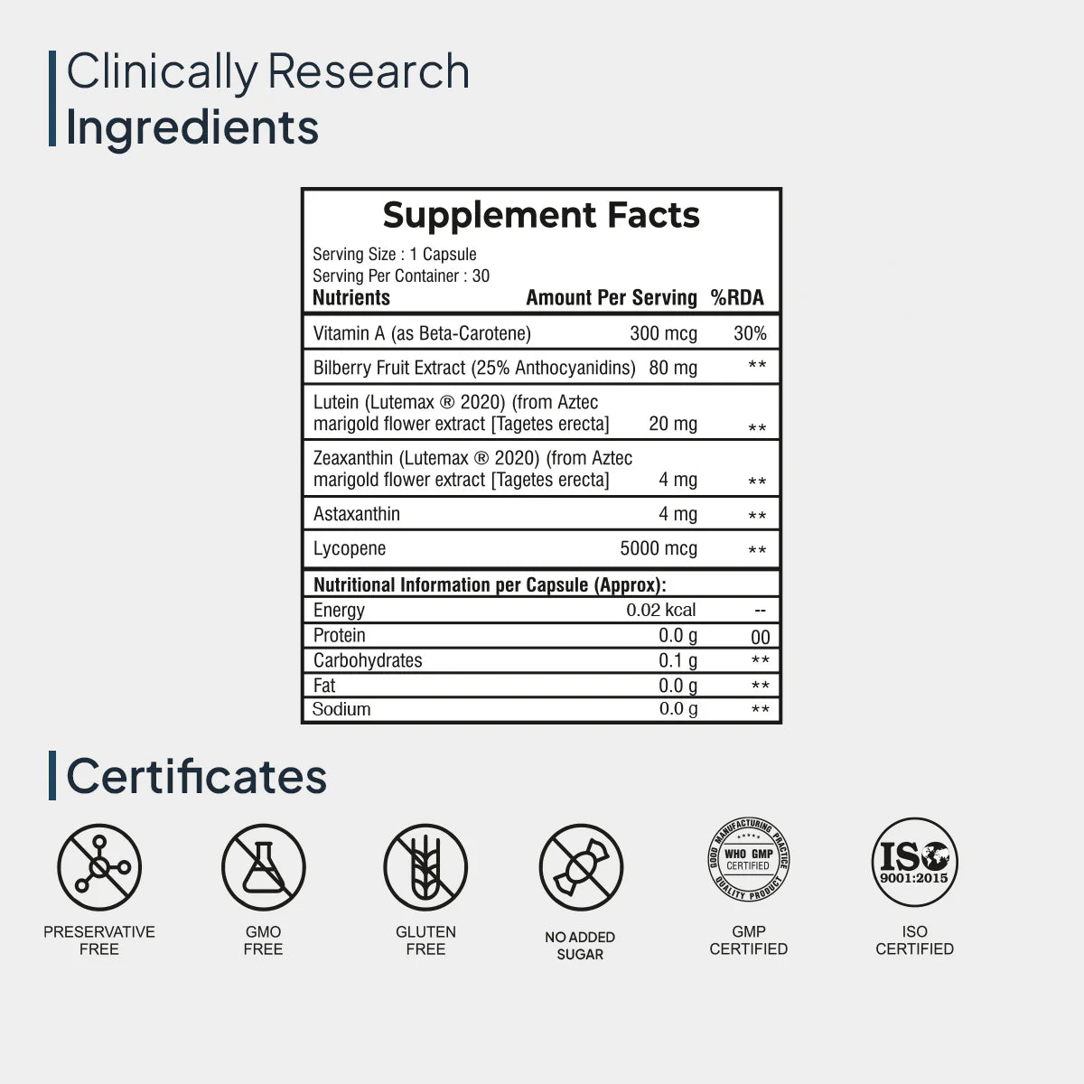 Miduty Eye Vision Shield is enriched with Patented Lutemax 2020 (Lutein & Zeaxanthin), Astaxanthin, Zinc, and Vitamin A to combat screen-induced eye stress and enhance vision clarity.