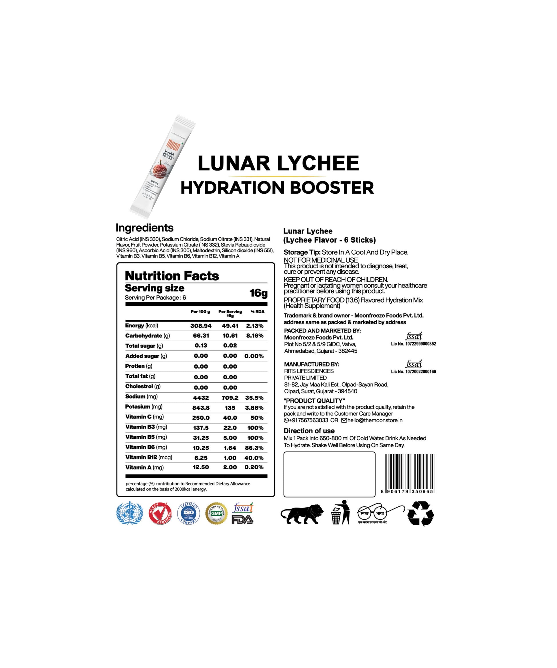 Lunar Lychee Hydration Booster is a refreshing electrolyte drink mix designed to replenish, revitalize, and support performance. Infused with natural lychee flavour, essential electrolytes, and a complete B-vitamin complex, it delivers deep hydration, sustained energy, and effective recovery—all in a light, low-calorie format.