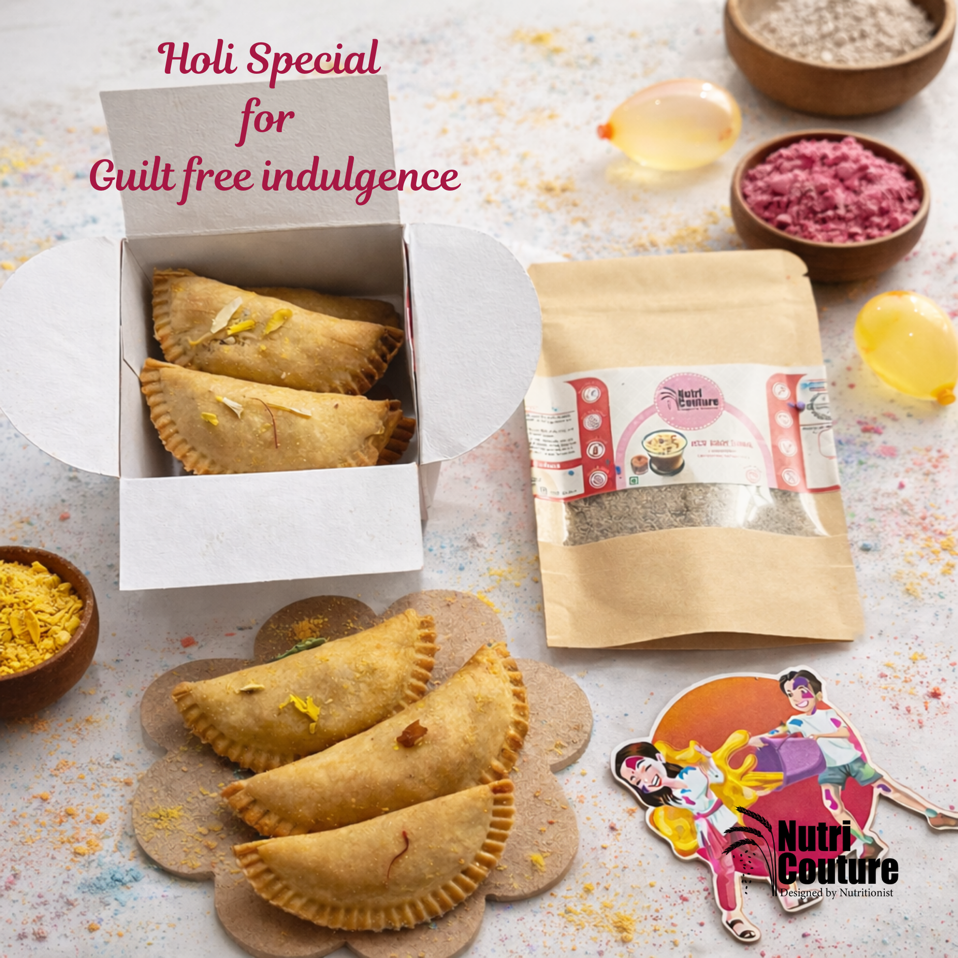 A festive mini Holi combo featuring baked whole wheat gujias and aromatic Badam Kesar Thandai — the perfect balance of tradition, taste, and mindful indulgence.