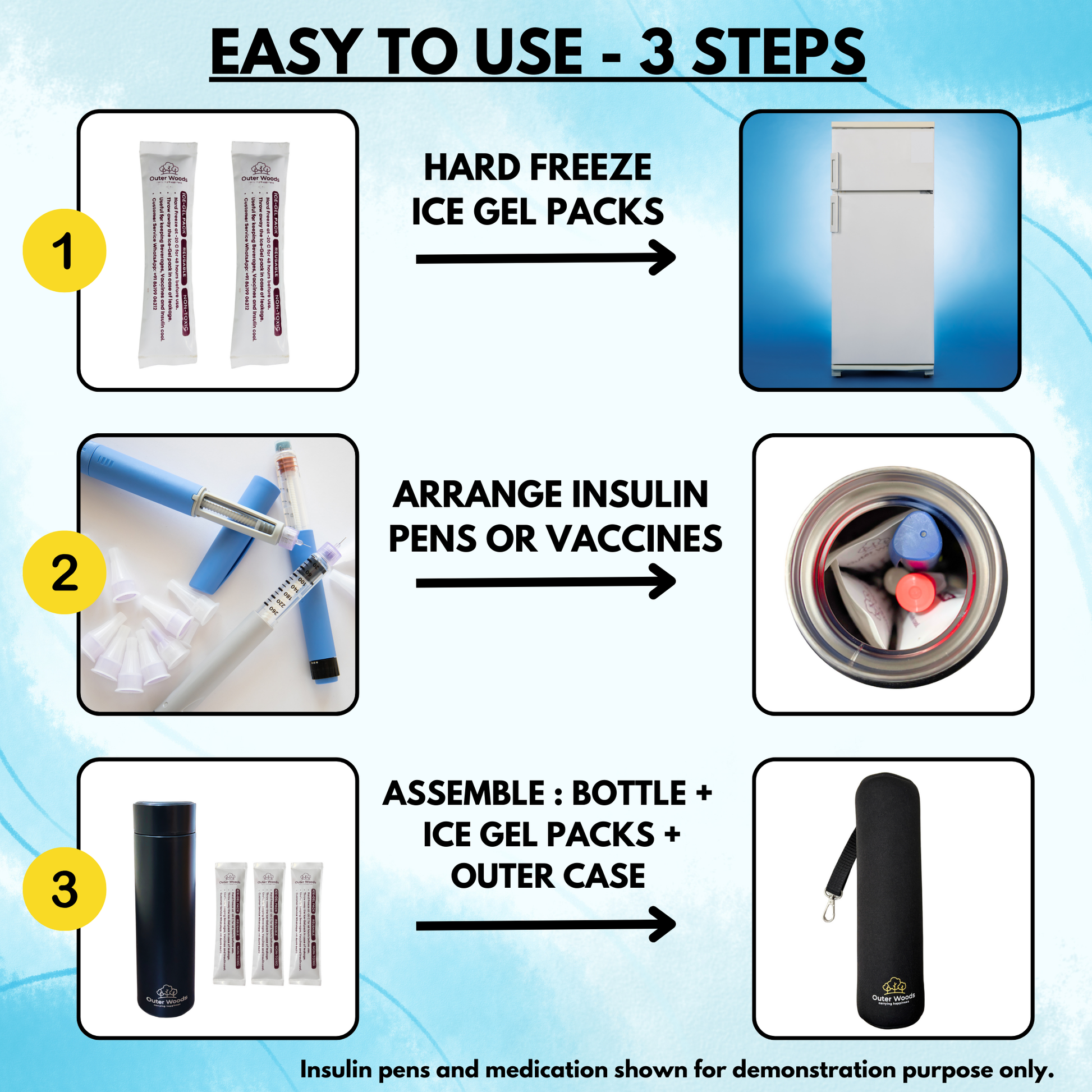 - Can accommodate up to 2 insulin pens (up to 6 inches each) and 3 mini ice gel packs