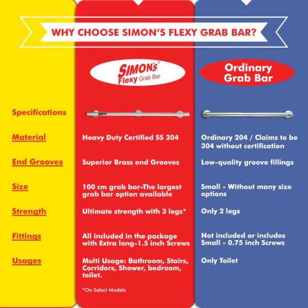 Simon's Flexy 304 Stainless Steel Grab bar for Bathroom and Toilet Safety Handle of Elderly People - (75cm – 100cm)