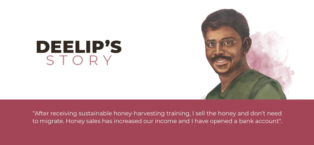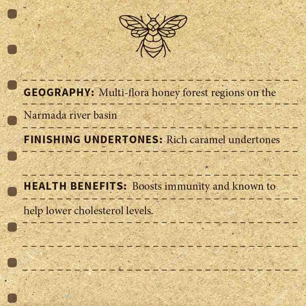 Mysterious, opaque and dark, this honey collected from the holy forests of Narmada’s river valley is complex in taste and texture. Hints of mossy earth mixed with the heavy sweetness of tropical rainforest flora makes this 100% pure and natural honey a wonderful addition to hearty breads, as toppings on waffles or mixed with cold coffee.